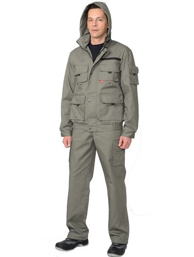 Костюм рабочий из смесовой ткани Родос.Куртка короткая, прямого силуэта, с центральной застёжкой на молнию накрытой ветрозащитным клапаном, воротник стойка, пристёгивающимся капюшоном, различными многофункциональными накладными карманами с клапанами. Рукава с манжетами и патой регулирующий ширину. Низ куртки с притачным поясом стянутым, частично, резинкой. Брюки прямые с притачным поясом стянутым, частично резинкой и застёгивающимся на пуговицу, со шлёвками, застёжкой гульфика на молнию, с различными функциональными карманами. Низ брюк регулируется эластичным шнуром. Производство: РФ, Сириус (Sirius)