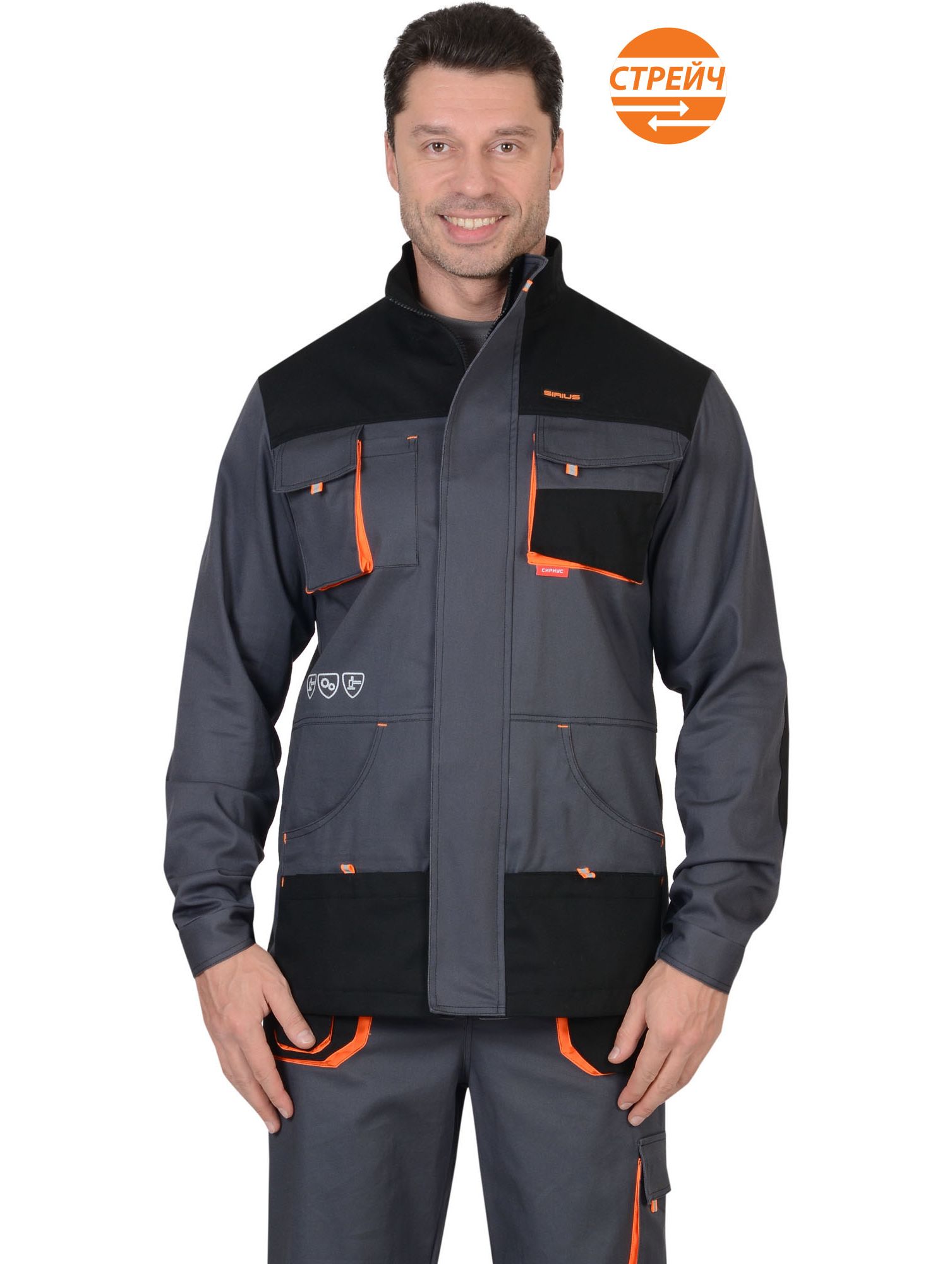 Куртка рабочая прямого силуэта; с центральной застежкой на «молнию»; с воротником стойка , с ветрозащитной планкой, с притачными манжетами , с накладными объемными верхними карманами с клапанами, с нижними объемными карманами .