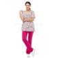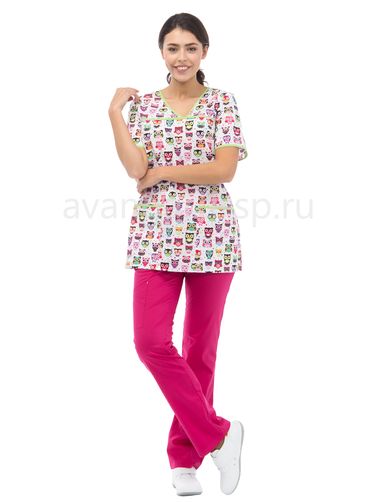 Блузамедицинская прямого силуэта из принтованной ткани с V-образным вырезом горловины. По переду горизонтальная кокетка над грудью и накладные карманы с отделениями для ручек по низу. Спинка с завязками от боковых швов, из ткани отделки, для регулировки объема по талии. Рукава втачные короткие. По низу боковых швов блузы – разрезы. По горловине, кокетке, верху карманов и по низу рукавов окантовка из ткани отделки.