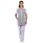 Блуза полуприлегающего силуэта удлиненная с центральной застежкой на молнию и небольшими разрезами в боковых швах. Вырез горловины – фигурный. Центральная часть переда серого цвета с накладными карманами с боковым входом. На полочках и спинке вертикальные рельефы, подчеркивающие изгибы женской фигуры. По талии центральной части спинки пояс из ткани серого цвета и шлевка для фиксации пояса и регулировки объема. Рукав короткий.