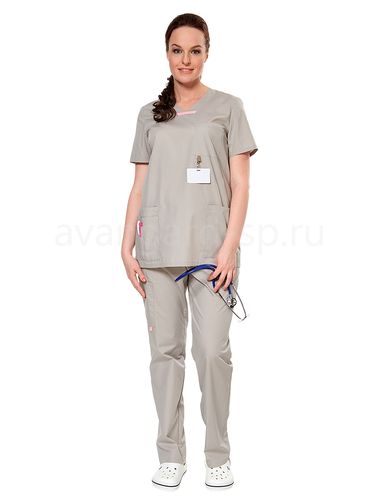 Комплект женский, состоит из блузы и брюк. Блуза удлиненная прямого покроя, горловина с планками и вставкой из декоративной тесьмы розового цвета, нагрудный карман с отделением для ручки и петлей для крепления бейджа, нижние накладные карманы, справа карман со множеством отделений, рукава длиной выше локтя. Брюки прямого покроя: пояс на резинке, с тесьмой для регулировки объема по талии, на правой брючине накладной карман.