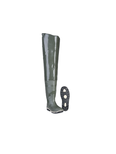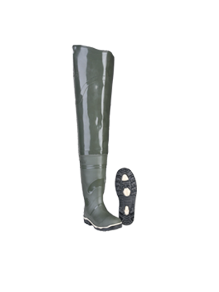 Высокие до бедер сапоги болотные выполнены из пластиката ПВХ (поливинилхлорида).На низ обуви используют сапоги "Специалист" в трехкомпонентном исполнении. На верх- цельнолитая надставка.Высокопрочное соединение верхней и нижней частей токами высокой частоты обеспечивают защиту от проникновения влаги во внутрь.