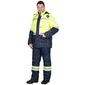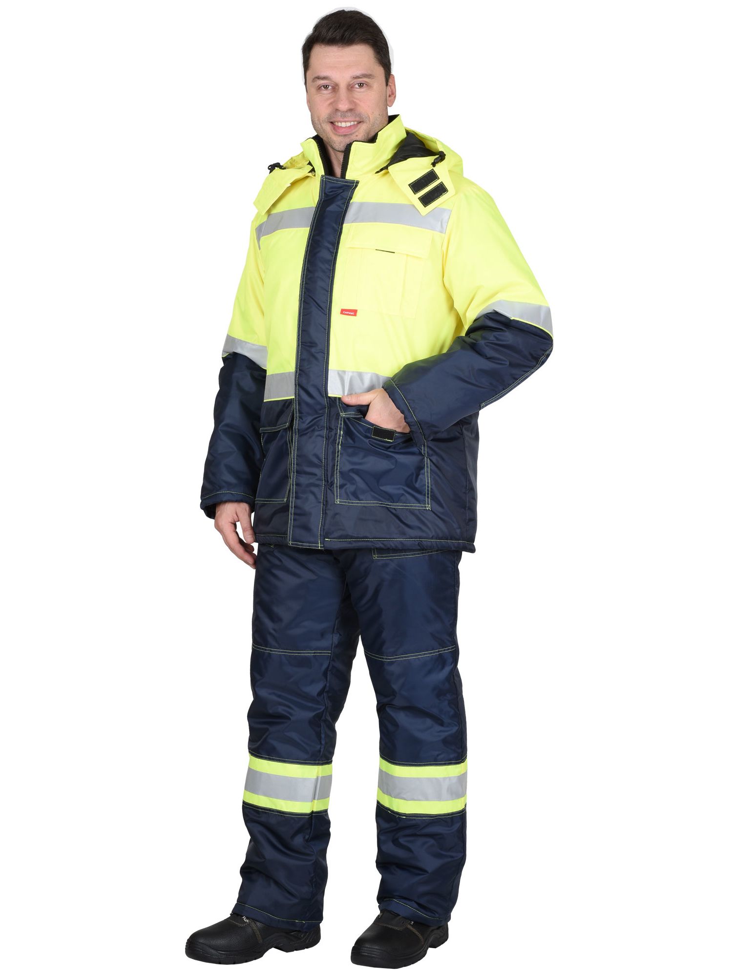 Костюм сигнальный утепленный состоит из куртки и полукомбинезона. Куртка прямого силуэта с притачной утепл.нной подкладкой, с центральной заст.жкой на двухзамковую т.сьму - «молнию» и ветрозащитным клапаном застегивающийся на липучку, воротником – стойка, верхним и нижними накладными карманами с клапанами на текстильную застежку - «липучку». С кулисой по линии талии, с внутренним карманом на «молнии». По кокеткам полочек, спинке в области талии и рукавов настрачивается СОП ш.50мм для обозначения сигнальной видимости.Полукомбинезон прямой, с центральной заст.жкой на двухзамковую тесьму - «молния», с накладными боковыми карманами, с наколенниками, с эластичной лентой по спинке, для лучшего прилегания. Бретели регулируются при помощи эластичной ленты и пряжек фастексов.По низу полукомбинезона настрачивается СОП ш.50мм для обозначения сигнальной видимости.